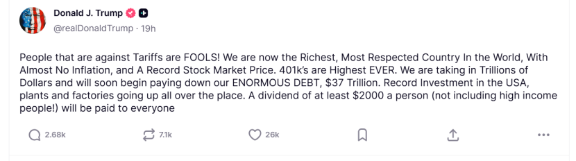 特朗普在帖子中写道:“我们正收取数万亿美元的关税收入,很快就会开始偿还我们高达37万亿美元的巨额债务。美国正迎来创纪录的投资,全国各地都在兴建各类工业生产设施。每个人都将获得至少2,000美元的红利(高收入人群除外)。”