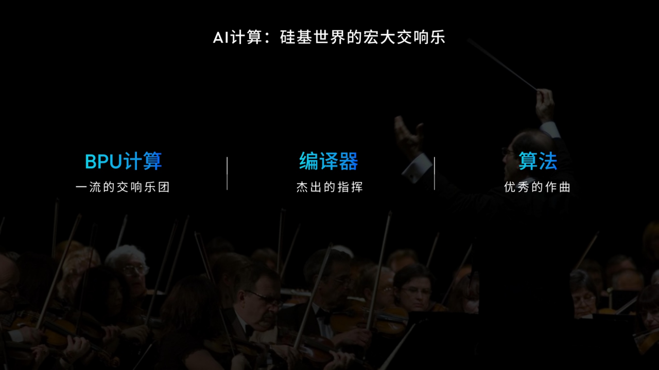 我想打一个形象的比喻,要达成我们追求的这样一个目标,就像是一个硅基世界宏大的交响乐。我们可以把地平线的神经网络处理器BPU,比作一个一流的交响乐团,这里面有丰富的算子,每个算子都非常厉害,但怎么样把它们组合在一起,完成一个整体的软件计算,这里面需要杰出的指挥,指挥就是一个乐团的灵魂,他怎么样把一个非常美妙的乐曲给拆解成每一个算子互相配合的行为,最后呈现出无与伦比的艺术作品。